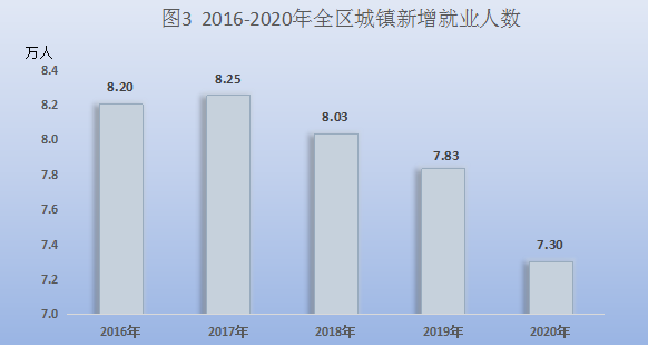 全年全区城镇新增就业人员7.3万人,农村劳动力转移就业80.27万人,年末全区城镇登记失业率为3.92%。全年全区农民工[3]总量为98.1万人,比上年减少8.0万人,下降7.5%。其中,外出农民工76.9万人,比上年减少5.8万人,下降7.0%;本地农民工21.2万人,减少2.2万人,下降9.4%。