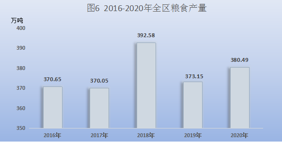全年全区粮食总产量380.49万吨,比上年增产7.34万吨,增长2.0%,连续十七年实现丰收。其中,夏粮产量29.05万吨,下降19.7%;秋粮产量351.45万吨,增长4.3%。全年全区小麦产量27.79万吨,下降19.7%;水稻产量49.39万吨,下降10.3%;玉米产量249.07万吨,增长8.1%;马铃薯产量(折粮)41.54万吨,增长5.3%。