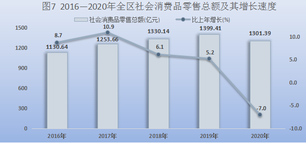 全年全区实现社会消费品零售总额1301.39亿元,比上年下降7.0%。按经营地统计,城镇消费品零售额1123.81亿元,下降7.1%;乡村消费品零售额177.58亿元,下降6.7%。按消费类型统计,商品零售额1137.04亿元,下降7.0%;餐饮收入额164.35亿元,下降7.2%。