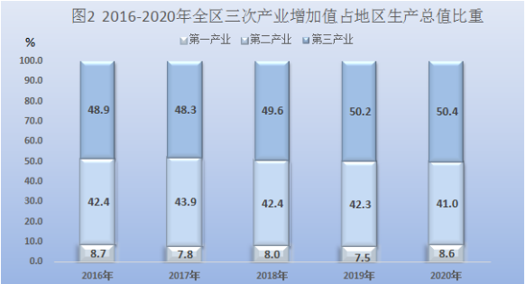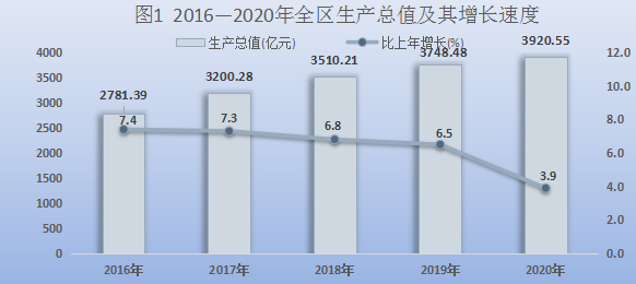 初步核算,全年全区实现生产总值[2]3920.55亿元,按不变价格计算,比上年增长3.9%。其中,第一产业增加值338.01亿元,增长3.3%;第二产业增加值1608.96亿元,增长4.0%;第三产业增加值1973.58亿元,增长3.9%。第一产业增加值占地区生产总值的比重为8.6%,第二产业增加值比重为41.0%,第三产业增加值比重为50.4%,比上年提高0.2个百分点。