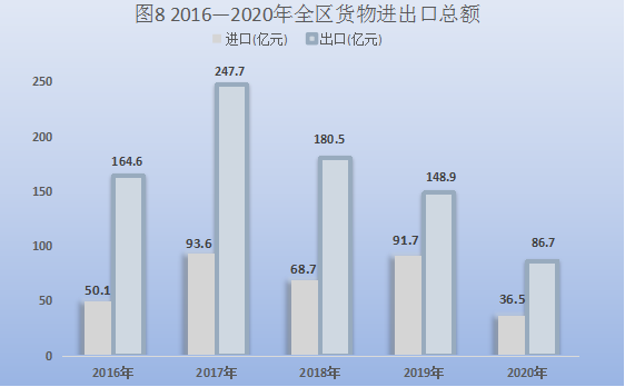 全年全区货物贸易进出口总额123.17亿元,比上年下降48.8%。其中,出口86.68亿元,下降41.8%;进口36.49亿元,下降60.3%。货物贸易进出口差额(出口减进口)50.19亿元。对“一带一路”沿线国家和地区进出口总额39.06亿元,下降43.2%。其中,出口35.02亿元,下降31.4%;进口4.04亿元,下降77.3%。
