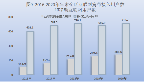 全年全区完成邮政业务总量[10] 24.98亿元,比上年增长25.0%。邮政业完成邮政函件业务240.06万件;包裹业务8.82万件;快递业务量7317.77万件,快递业务收入11.83亿元。全年全区完成电信业务总量[11]924.4亿元,增长24.2%。年末全区电话用户总数890.6万户,其中移动电话用户839.2万户。(固定)互联网宽带接入用户283.6万户,比上年增加24.5万户。移动互联网用户712.7万户,比上年增加26.8万户;移动互联网接入流量115767.2万GB,增长32.3%。