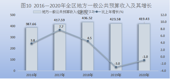 全年全区一般公共预算总收入704.1亿元,比上年下降5.8%。其中,地方一般公共预算收入419.4亿元,下降1.0%。在地方一般公共预算收入中,税收收入263.8亿元,下降1.4%,占地方一般公共预算收入的62.9%。