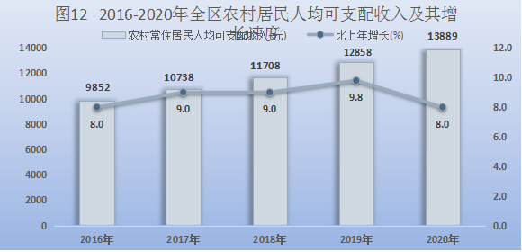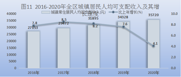 全年全区全体居民人均可支配收入25735元,比上年增长5.4%。按常住地分,城镇居民人均可支配收入35720元,增长4.1%;农村居民人均可支配收入13889元,增长8.0%。