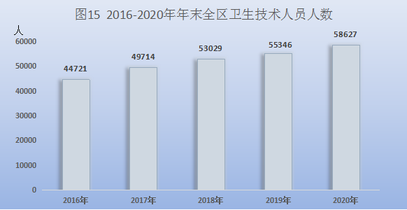 年末全区共有医疗卫生机构4574个,其中医院218个;基层医疗卫生机构4247个,其中卫生院205个,城市社区卫生服务机构231个,村卫生室2172个;专业公共卫生机构94个,其中疾病预防控制中心25个,卫生监督机构24个。年末全区卫生技术人员58627人,其中执业医师和执业助理医师22240人,注册护士25972人。全区医疗卫生机构实有床位41261张,其中医院35565张,基层医疗卫生机构4094张。全年全区总诊疗人次[15] 3969.83万人次,入院人数[16] 106.89万人次。